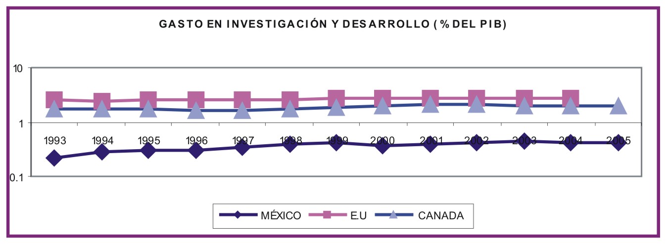 Los indicadores para México demuestran que los recursos monetarios destinados a ciencia y tecnología, al igual que en educación, son escasos al no representar ni el uno por ciento del producto interno bruto, mientras que sus principales socios comerciales, Estados Unidos y Canadá, invierten entre el dos y tres por ciento como se observa en la grafica 3. El reflejo de esta deficiencia se manifiesta en la creciente cantidad de insumos importados para fabricar mercancías nacionales. No existe eslabonamiento industrial y nuestros productos poseen un bajo valor agregado; la dependencia de materias primas externas nos hace más vulnerables a la escasez y los movimientos volátiles de los precios. El Tratado de Libre Comercio firmado en 1994 por México, Canadá y Estados Unidos como parte del movimiento globalizador favoreció la creación de un área de comercio libre que incrementó el flujo de mercancías entre los tres países. Sin embargo con la notable diferencia en el poderío tecnológico, México enfrenta una desventaja y un reto monumental al equipararse a sus socios.